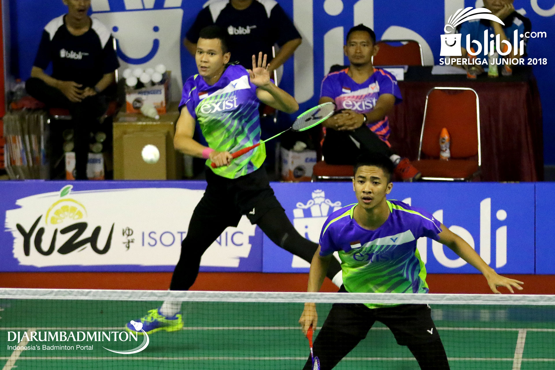 Caesar Bagus Sadewo/Dejan Ferdinansyah (PB. EXIST) menyambar pengembalian