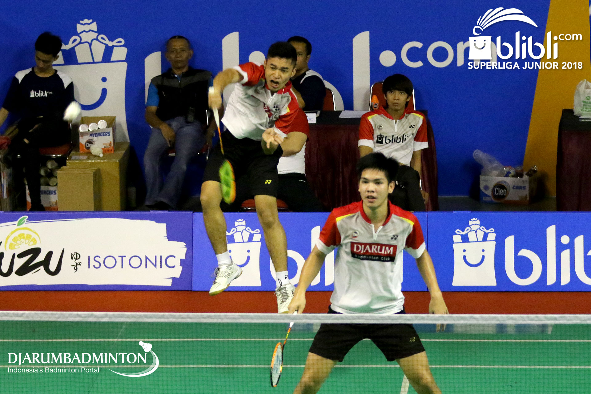 Daniel Marthin/Leo Rollycarnando (PB. DJARUM) berusaha mengembalikan shuttlecock