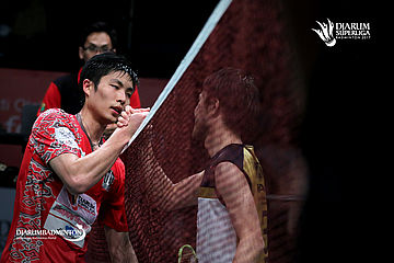 Chou Tien Chen (PB Musica Champion) bersalaman dengan Naohiro Matsukawa (Hitachi) usai bertanding.