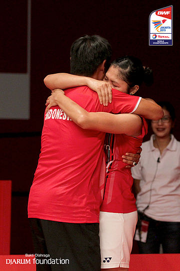 Ekspresi Lindaweni Fanetri (INA) memeluk pelatihnya setelah memenangkan petandingan