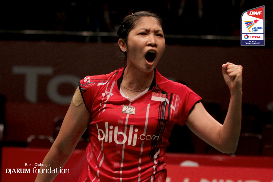 Ekspresi Lindaweni Fanetri (INA) saat meraih poin