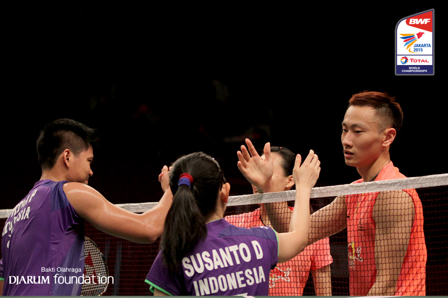 Praveen Jordan/Debby Susanto (INA) bersalaman seusai bertanding
