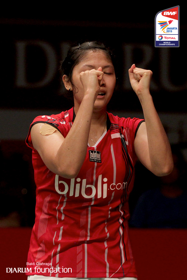 Ekspresi Lindaweni Fanetri (INA) saat memenangkan pertandingan
