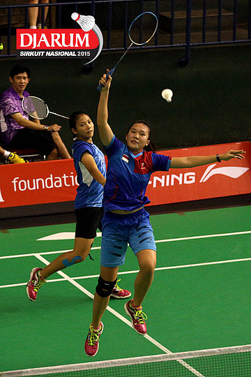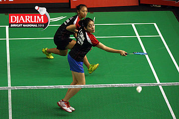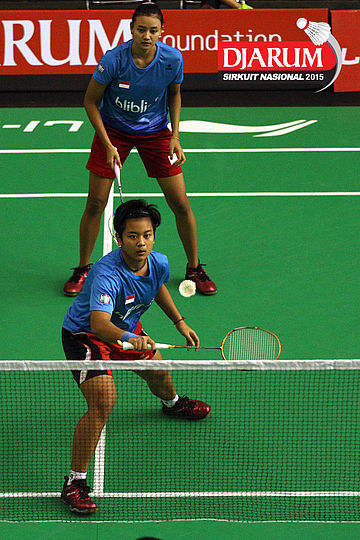 Komala Dewi/Vita Marissa (Djarum Kudus) bersiap menyambut pengembalian dari Maria Natalia/Monica Sandia (Focus).