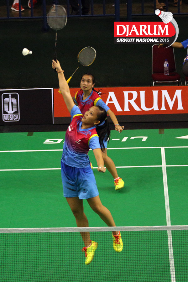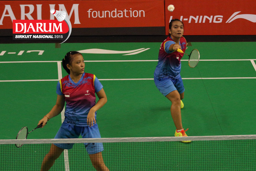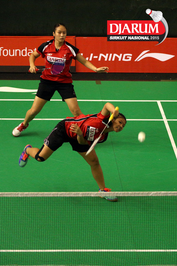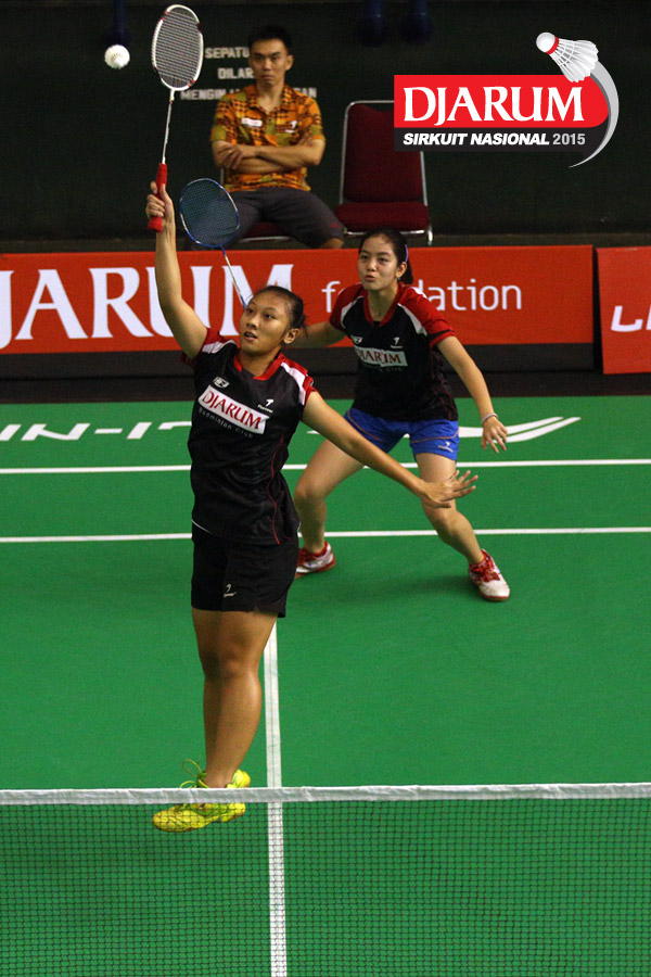 Felicia Parmenas/Tutut Novi (Djarum Kudus) mengembalikan shuttlecock ke arah Aliana Kurniawati/Istrati Putri (Candra Wijaya/JR Enkei).