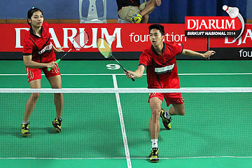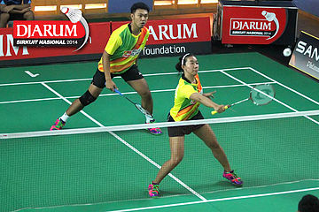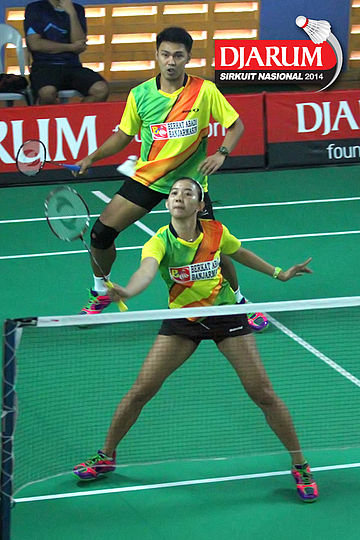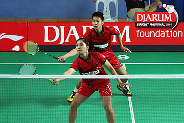 Rizky Hidayat/Nadya Melati (Hi Qua Wima/Pertamina Indonesia) bersiap menyambar pengembalian dari Ricky Alverino/Ristya Ayu (PB Djarum).