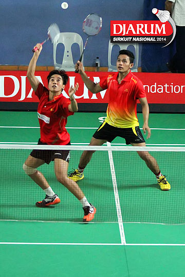 Anggun Nugroho/Keshya Nurvita Hanadia (Halim/SGS PLN) bersiap menyambut pengembalian dari Stefan Indra/Aris Budiharti (Mutiara Bandung/Jaya Raya).