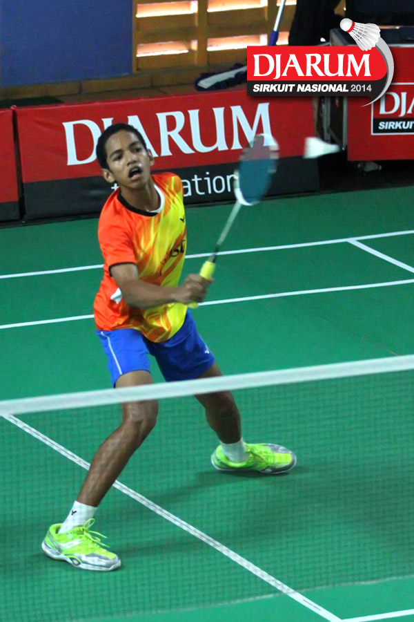 Senatria Agus (SGS PLN) mengembalikan shuttlecock ke arah Nugroho Andi (JR Enkei).