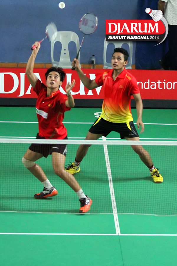 Stefan Indra/Aris Budiharti (Mutiara Bandung/Jaya Raya) bersiap mengembalikan shuttlecock ke arah Anggun Nugroho/Keshya Nurvita Hanadia (Halim/SGS PLN).