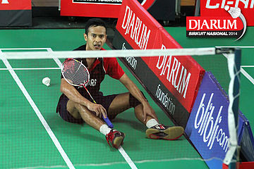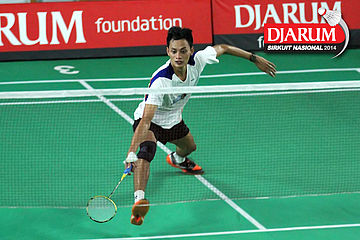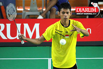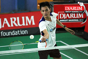 Fauzi Adnan (Jaya Raya Suryanaga) melepaskan serve.