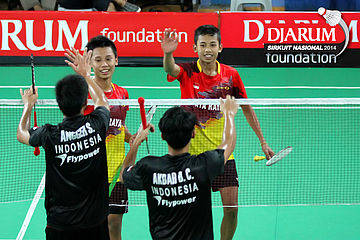 Pasangan ganda taruna putra Jaya Raya, Danang Dwi/Ridho Islami (atas) bersalaman dengan Akbar Bintang/Angger Sudrajat (PB Djarum) usai bertanding.