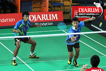 Achmad Fasich/Ragawa Tamasuta (Citra Raya Unesa/Semen Gresik) menyambut serve dari Jeka Wiratama/Vicky Rizky (PB Djarum).