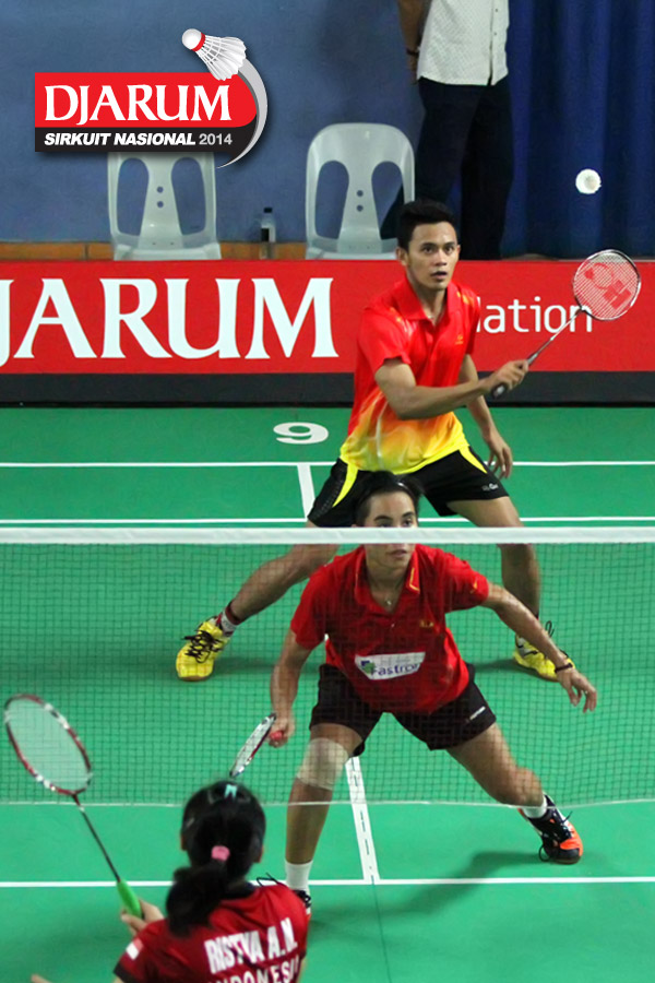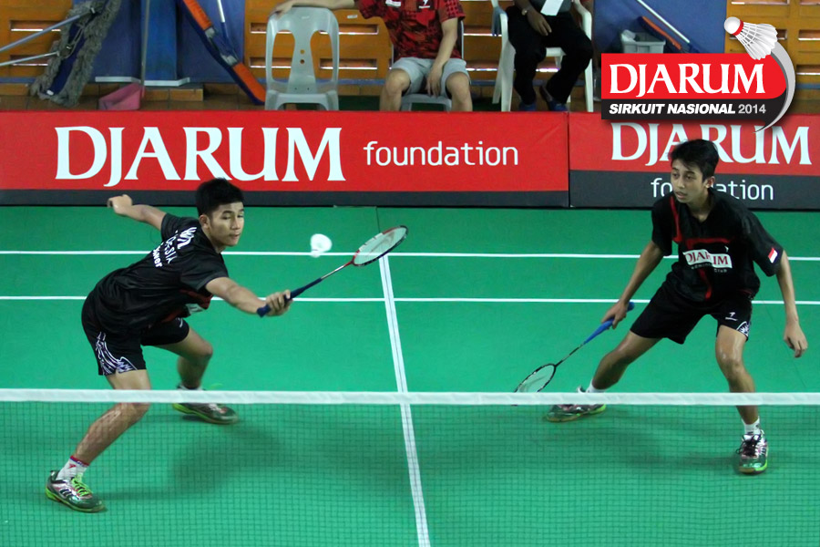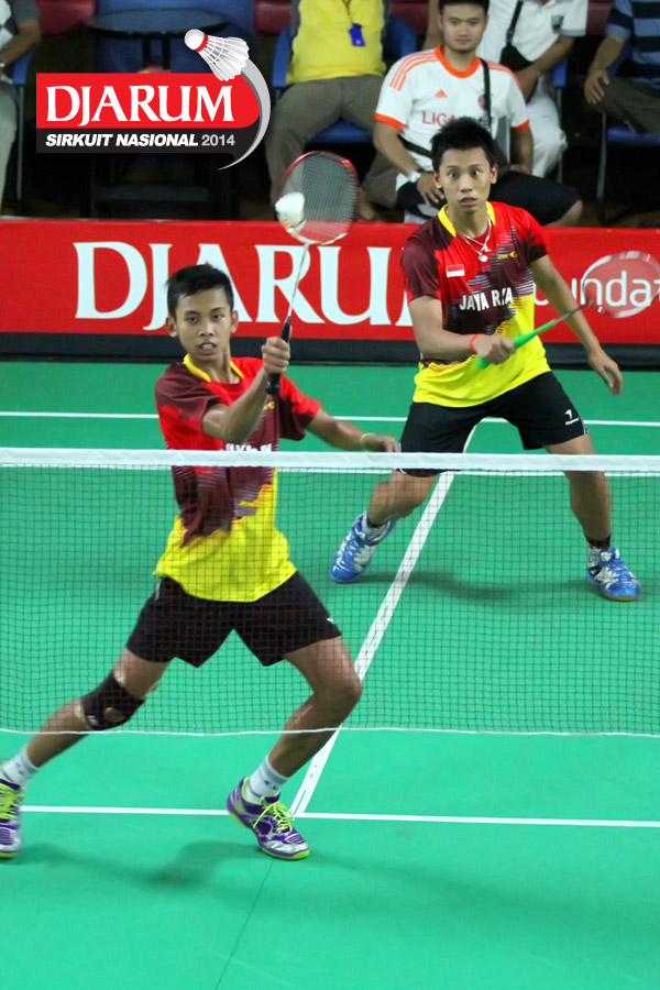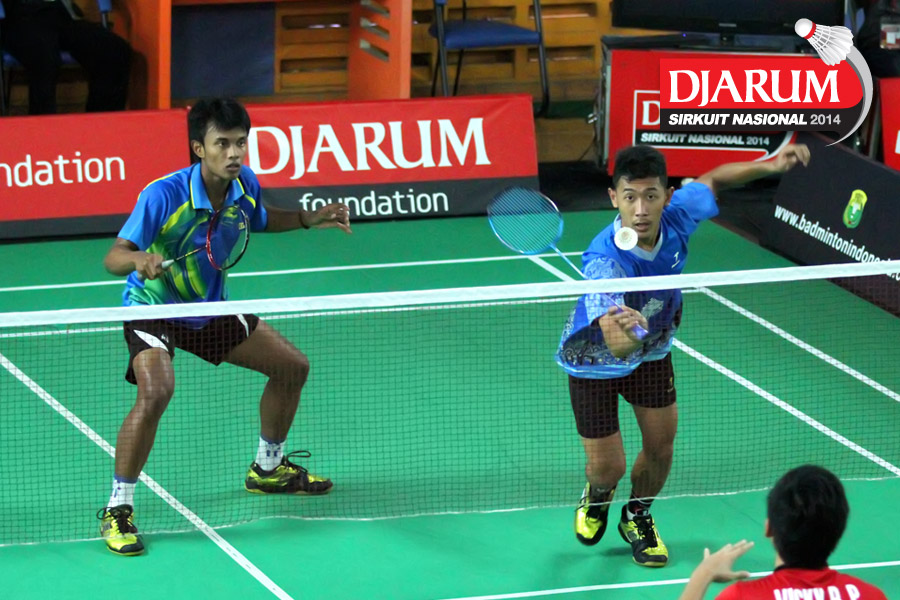 Akbar Gusti/Ardy Nugroho (PB Djarum) menghadang serangan bertubi-tubi yang dilepaskan pasangan Amri Syahnawi/Riyan Tri (SKO Ragunan).