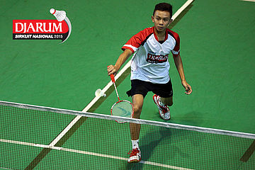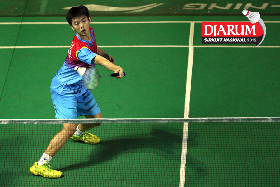 Calvin Ryan (Djarum Kudus) mengembalikan shuttlecock ke arah M. Rofiq Andira (Mentari RBT).