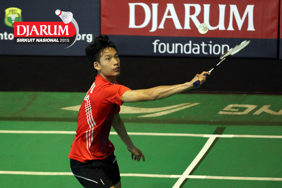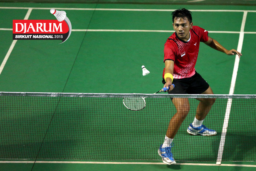 Ramdhani M. Zulkifli (Djarum Kudus) bersiap menyanbut pengembalian dari Travis Moniaga (Tangkas).