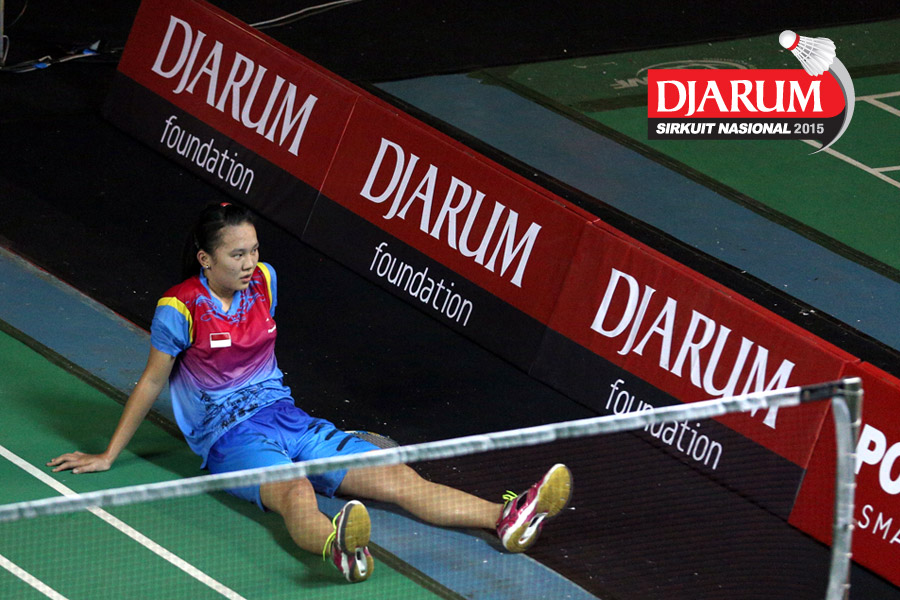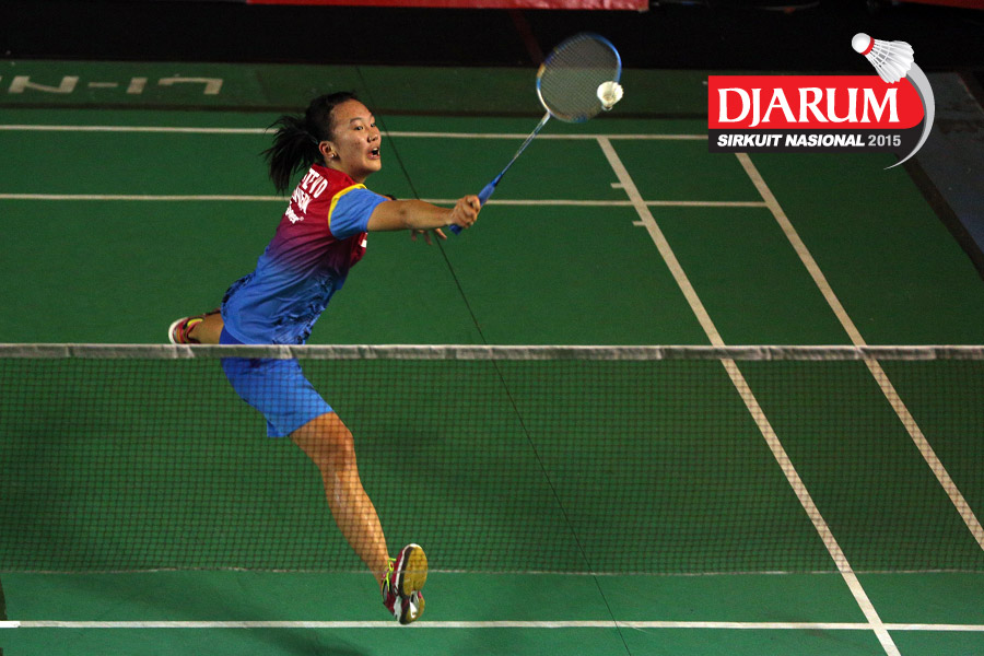 Febby Angguni (Tjakrindo Masters) mengembalikan shuttlecock ke arah Rafika Mutiara (Candra Wijaya).