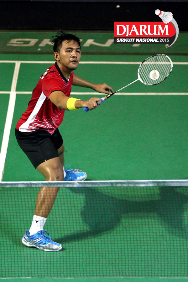 Vicky Angga (Tangkas) mengembalikan shuttlecock ke arah Indra Setiawan (Pertamina Fastron).