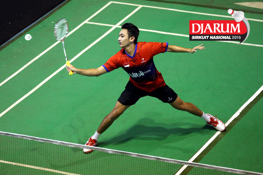 Indra Setiawan (Pertamina Fastron) mengembalikan shuttlecock ke arah Vicky Angga (Tangkas).