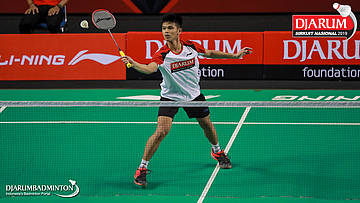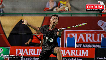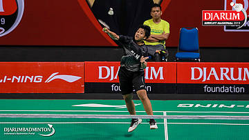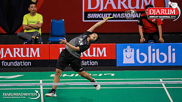 Aldy Firmanda (PB Djarum, Kudus) melepaskan serangan