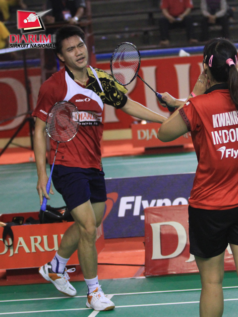 Ekspresi kemenangan pasangan pemain PB Djarum, Arsya Isnanu Ardi Putra/Della Augustia usai mengalahkan pasangan Ihsan A.W/Vicya Sandra dari Guna Dharma dengan skor 21-5 dan 21-15