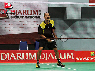 Jeffer Rosobin (Rosobin Jakarta) berhadapan kontra M. Junaedi (Pelabuhan II) di babak pertama tunggal putra Djarum Sirkuit Nasional Sulawesi Selatan Open 2012.