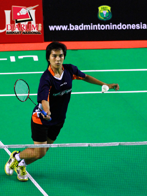 Rena Asela (PB Djarum) mengembalikan kok ke arah Nadya Puteri (Mutiara Bandung).