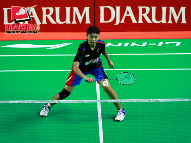 Aida Arum (PB Djarum) menahan serangan yang dilancarkan Mitzi Abigail (Sarwendah).