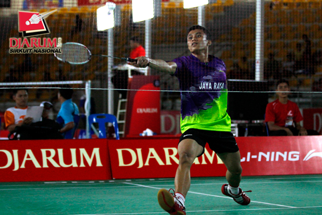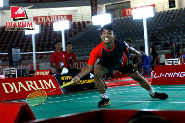 Eka Fajar (Jaya Raya) mengembalikan shuttlecock ke arah Rino Ramadhika (Pelatprov DKI Jakarta).