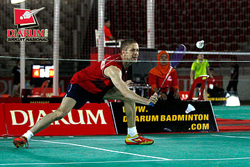 Michael Peter (Inggris) berhasil menahan serangan yang dilepaskan Rizky Antasari (Hi Qua Wima).