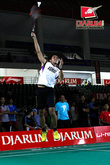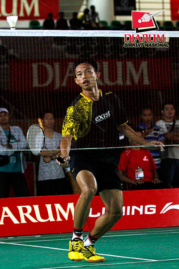 . Fauzi Adnan (Jaya Raya Suryanaga) bersiap mengembalikan shuttlecock ke arah Yogi Irvans (Angkasa Prestasi Gemilang).
