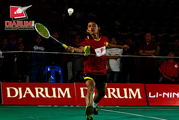 Reksy Aureza (PB Djarum) mengembalikan shuttlecock ke arah Bandar Sigit Pamungkas (Sarwendah).
